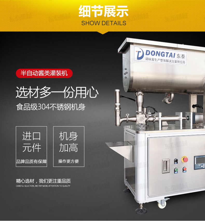 半自動灌裝機械,配置的自動攪拌器,保證了醬和油的充分混合,可灌裝顆粒漿狀流體物料在對辣椒醬、拌面醬、豆鼓等醬類進行灌裝時,灌裝量可在規(guī)定范圍內(nèi)任意調(diào)節(jié),計量誤差小,該半自動醬類灌裝機采用壓縮空氣為動力可在各種環(huán)境中使用。