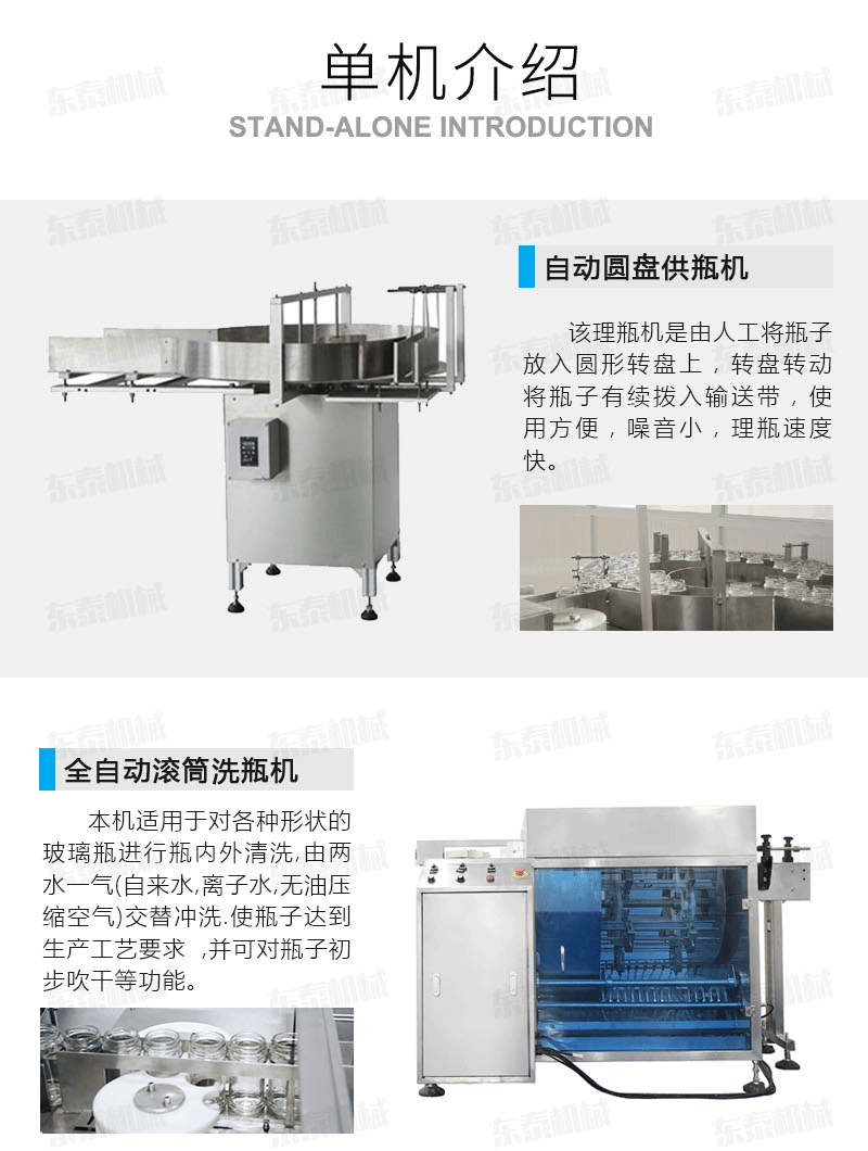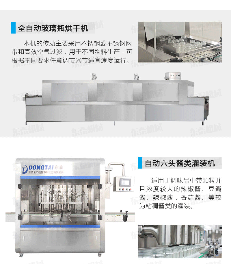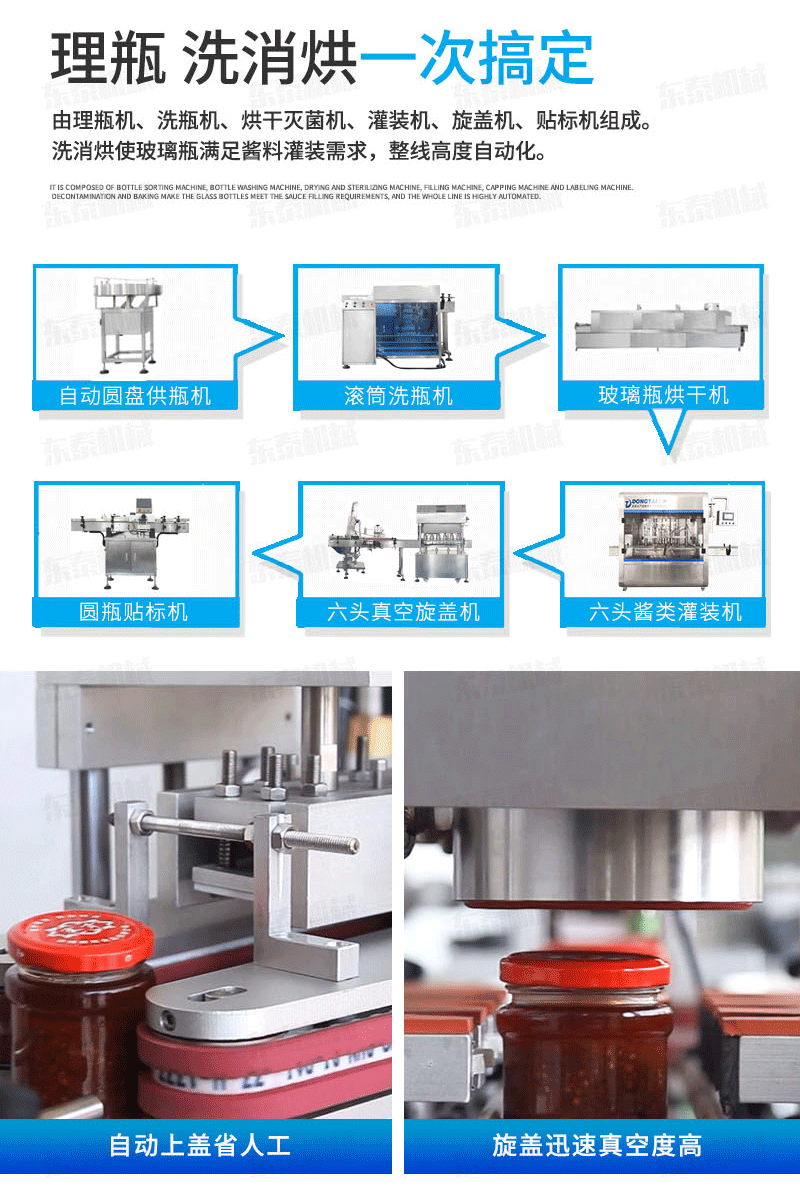 自動供瓶機+全自動滾筒洗瓶機+自動六米烘干機+自動收瓶機+全自動六頭灌裝機自動灌裝+全自動提蓋機自動理蓋、提蓋、掛蓋+六頭真空旋蓋機同時六個頭真空旋蓋+套標(biāo)機+收縮機+圓瓶貼標(biāo)機+整理平臺;