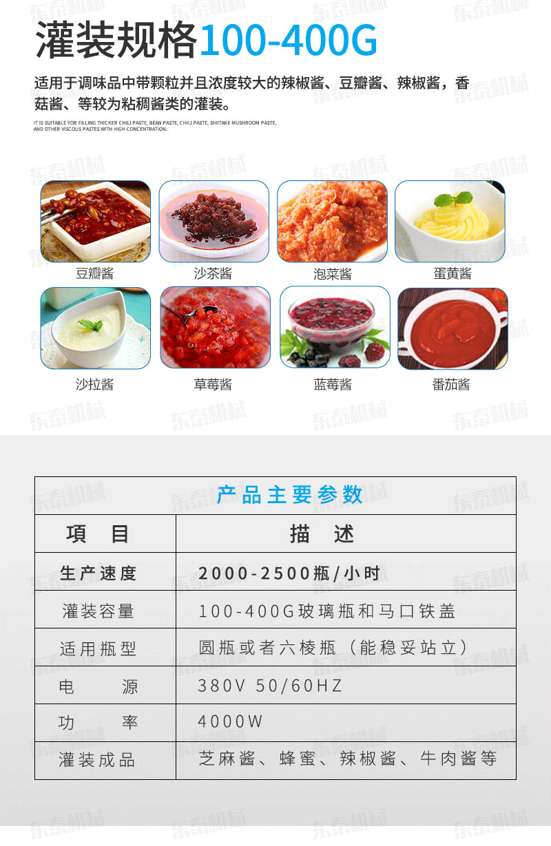 為了能夠更好的服務(wù)社會我們東泰辣椒醬灌裝機(jī)踏上了多樣化生產(chǎn)道路,并且現(xiàn)在已經(jīng)有了一定的顯著成績,原來的傳統(tǒng)設(shè)備由于功能有所局限,只能灌裝普通的醬料,而經(jīng)過我們改進(jìn)后的全自動辣椒醬灌裝機(jī)能夠?qū)崿F(xiàn)對市場上絕大多數(shù)的醬料的灌裝,尤其是那些含顆粒的顆粒漿狀流體、半流體、膏體、漿狀類的物料灌裝,如辣椒醬、牛肉醬、牛肉大醬、豆瓣醬、芝麻醬、果醬、火鍋底料的等物料的灌裝,在市場中,辣椒醬灌裝機(jī)有眾多的機(jī)會來展現(xiàn)出自我的風(fēng)采,不僅是因?yàn)樵偈袌鲋械膹V泛應(yīng)用,還有這十分出眾的全自動化的一鍵式的完成一系列的工作流程,更能夠凸顯出市場對于它自身的需求。